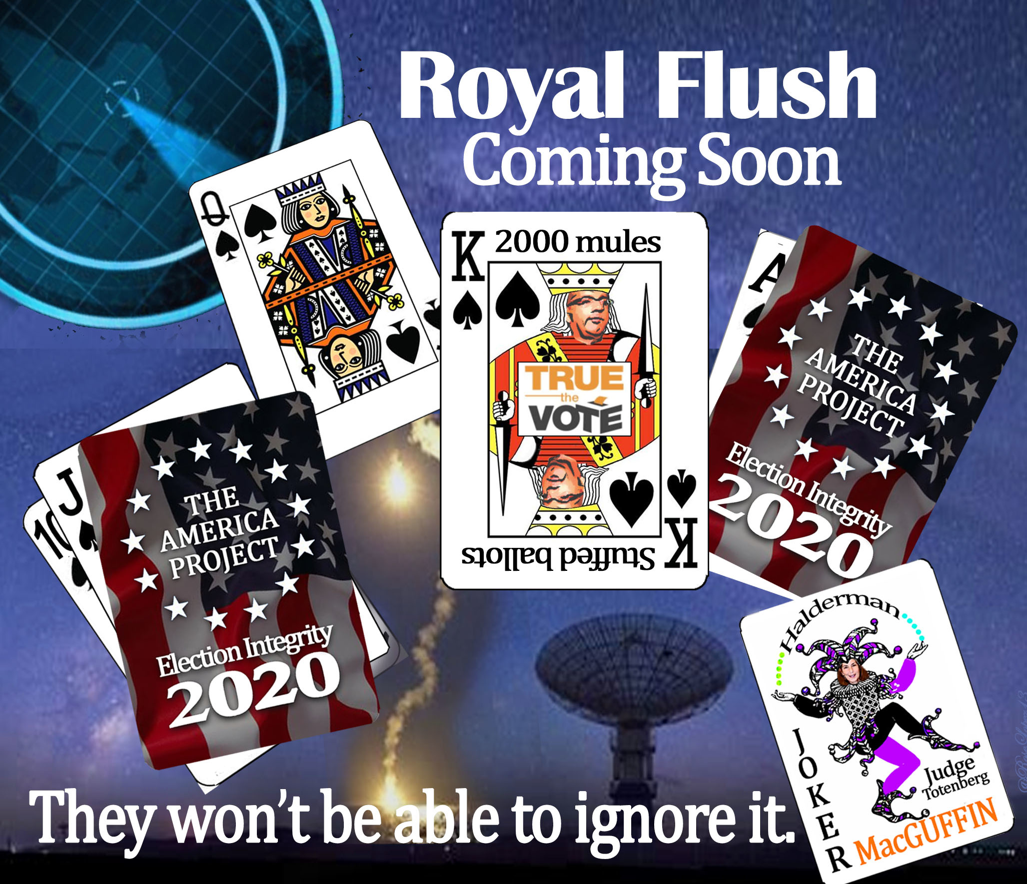 The America Project is working on a Royal Flush See their Rumble account for details. Meanwhile he Joker is released as a MacGuffin. Judge Amy Totenberg sealed a report which was a nothing burger unless released BEFORE 2020 election. 2000 mules is coming soon to theaters the rest of the cards to follow.