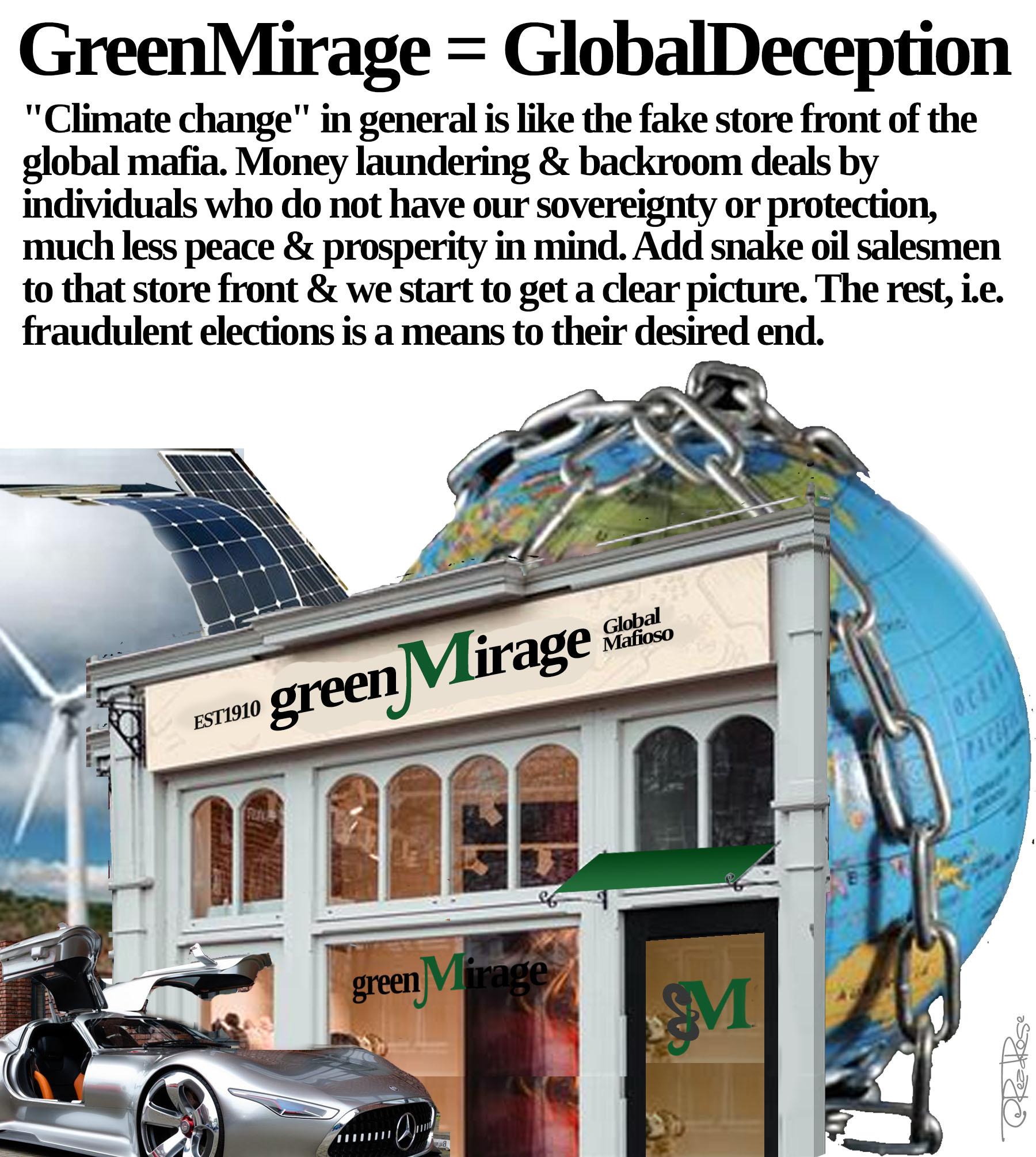 "Climate change" in general is like the fake store front of the global mafia. Money laundering & backroom deals by individuals who do not have our sovereignty or protection, much less peace & prosperity in mind. Add snake oil salesmen to that store front & we start to get a clear picture. The rest, i.e. fraudulent elections is a means to their desired end.